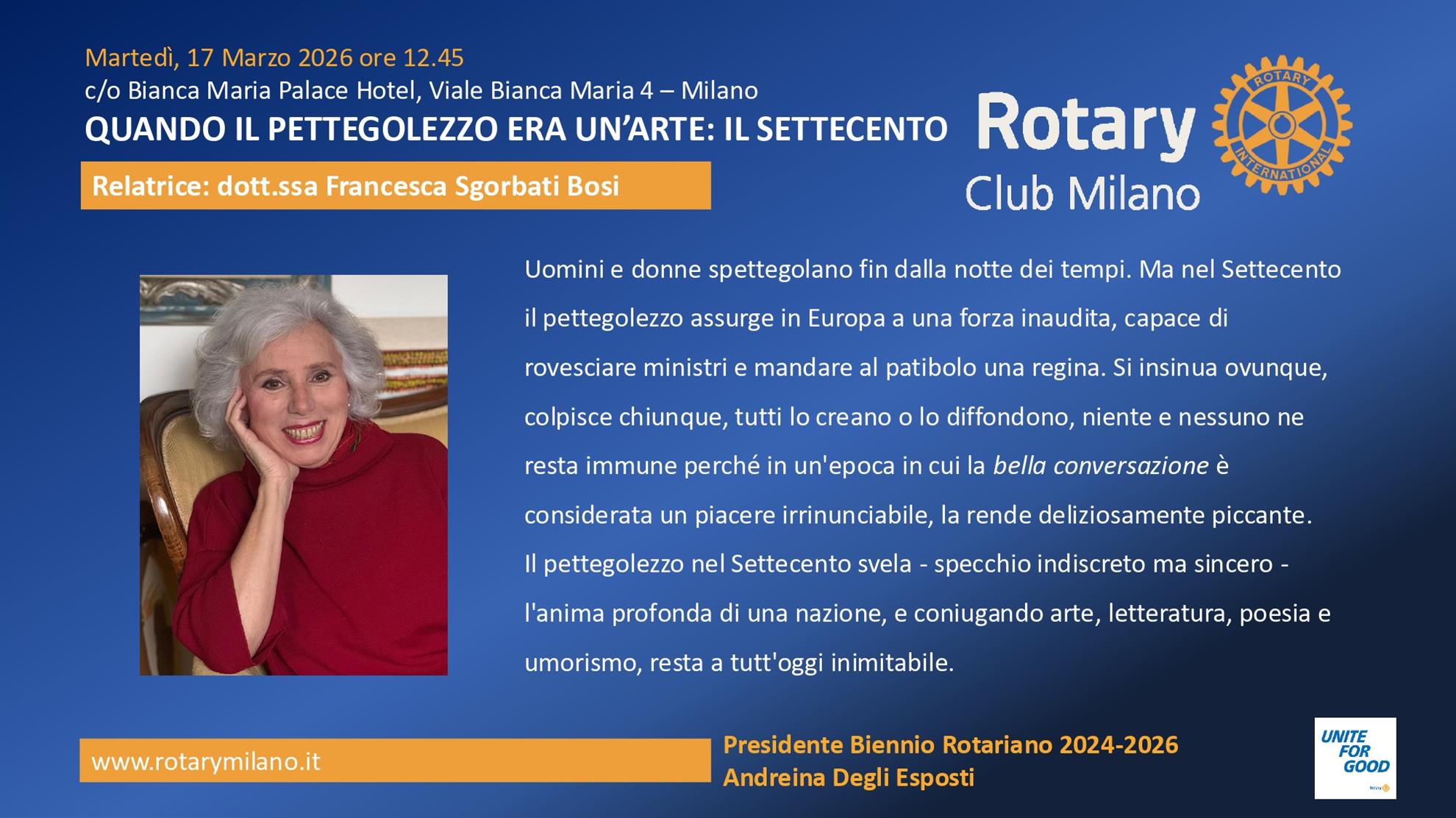 Francesca Sgorbati Bosi, laureata in lingue moderne presso l'Università Cattolica di Milano con una tesi su The Beggar's Opera di John Gay, si dedica da molti anni allo studio del XVIII secolo inglese e francese, con particolare attenzione alla vita quotidiana e alla condizione delle donne. Con Sellerio ha pubblicato Guida pettegola al Settecento francese (2013); Guida pettegola al teatro francese del Settecento (2014); A Tavola coi re. La cucina ai tempi di Luigi XIV e Luigi XV (2017), Non mi attirano i piaceri innocenti. Costumi scandalosi nella Parigi del Settecento (2019); Nobili contraddizioni. Vizi e virtù dell’aristocrazia inglese del Settecento (2023); Guida pettegola al Settecento inglese (2024).